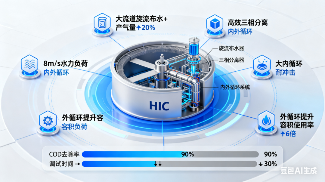 厌氧技术更新迭代:环保公司自主研发的HIC厌氧反应器,突破了传统反应器布水不均、调试周期长、稳定性差的瓶颈。通过结构优化与水力创新,COD去除率提升至90%以上,调试时间缩短30%,目前已成功应用于蓉生血制、汉江药业、珠海润都、逸舒制药等多个重大项目。目前该技术已获国家专利,成为处理高浓度有机废水的“利器”。