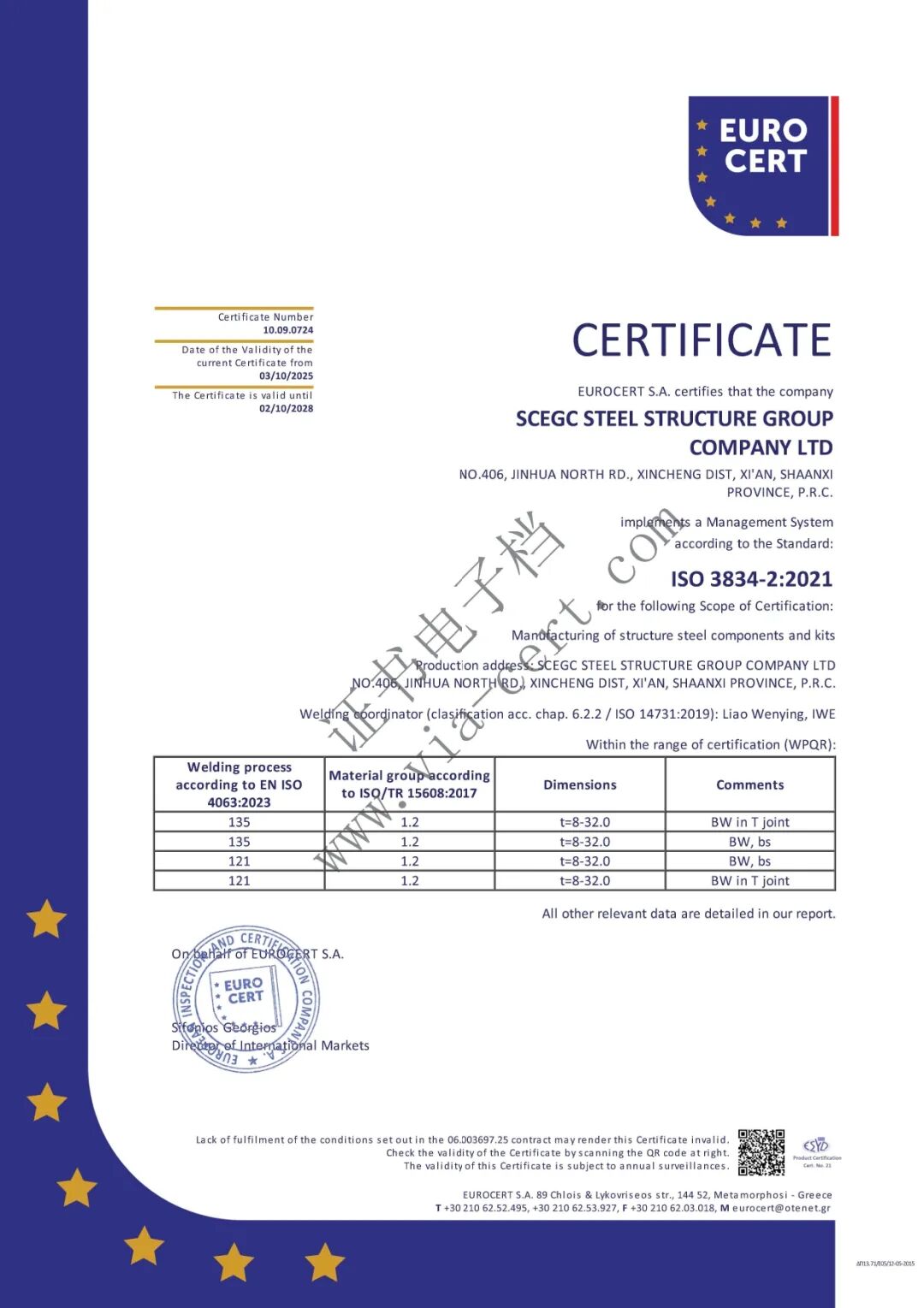 作为欧盟市场准入的“硬核通行证”,EN1090认证是钢结构产品进入欧盟及欧洲经济区的必备条件,意味着钢构集团已具备承接欧盟范围内建筑钢结构及非标钢结构项目的资格。而ISO3834认证则是国际焊接领域的权威认可,充分证明集团在焊接工艺管控、人员资质管理、质量体系运行等方面已达到国际先进水准,能够为海外项目提供稳定可靠的焊接质量保障。双认证的叠加,不仅是对钢构集团技术实力与质量管理能力的双重肯定,更打破了开拓海外市场的技术壁垒,为业务全球化扫清了关键障碍。