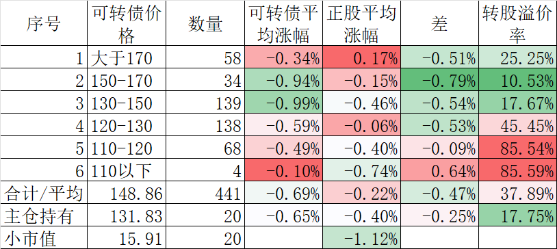 441只可转债平均下跌0.69%,对应正股平均下跌0.22%。我的主仓20只可转债平均下跌0.65%,对应正股平均下跌0.40%。